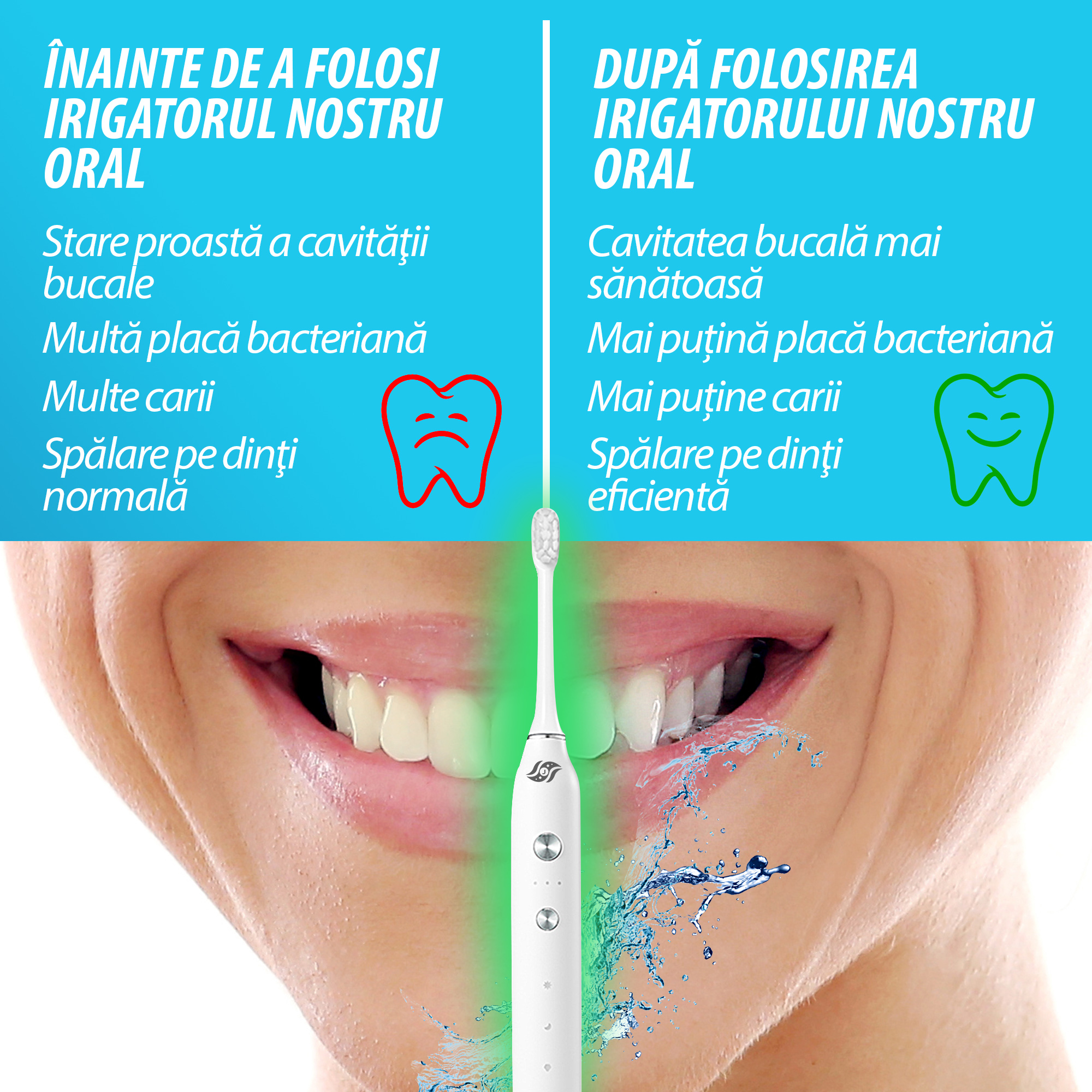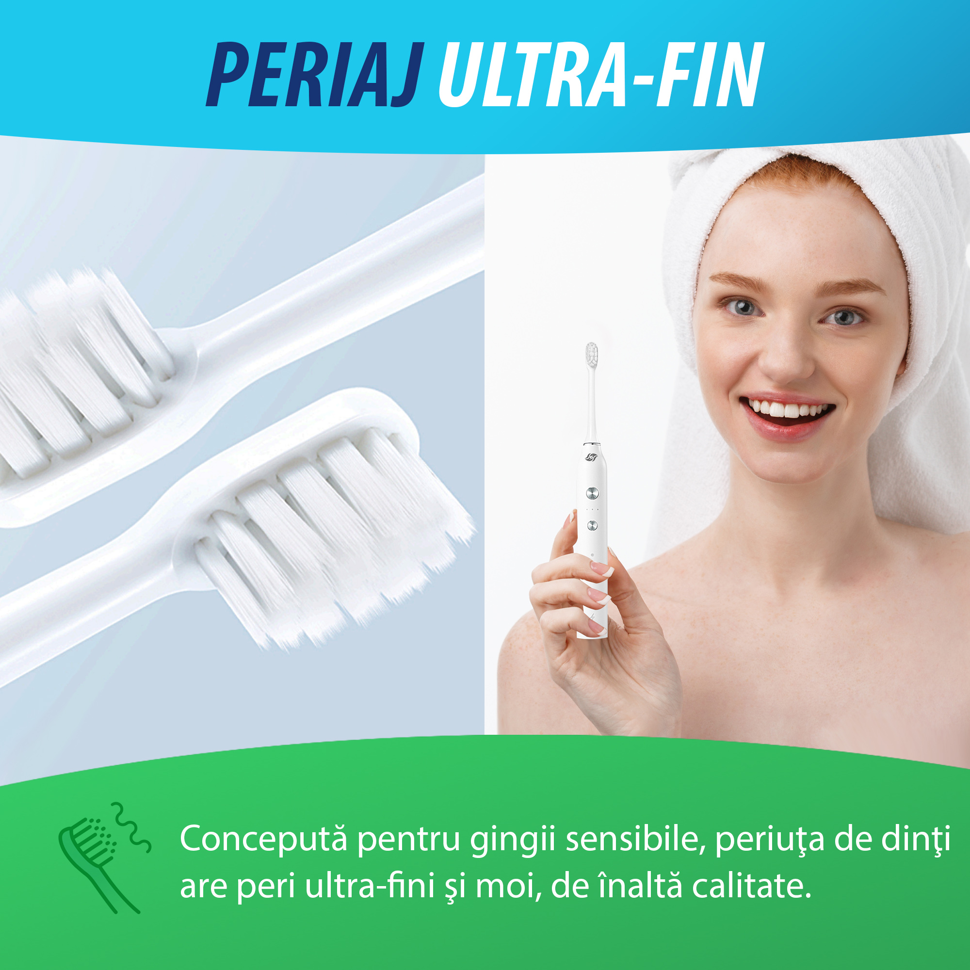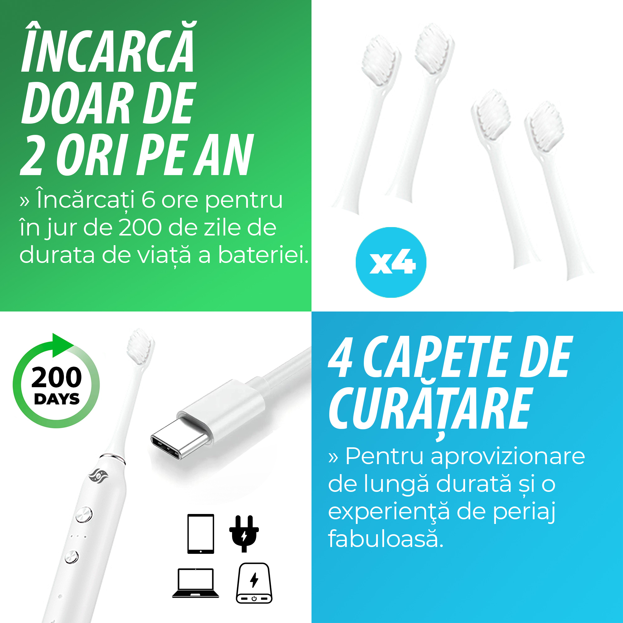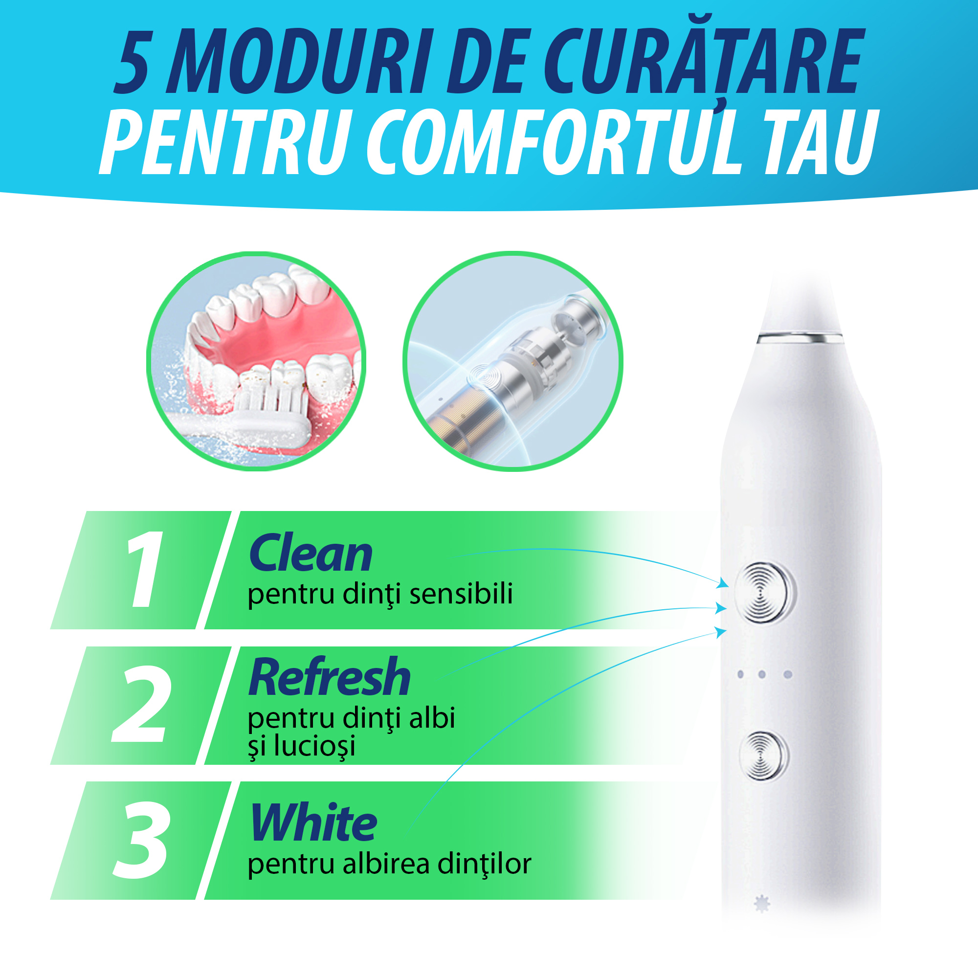 - 3 Moduri de Periaj Personalizate: Alege din 3 moduri diferite – Clean, Refresh, White – fiecare cu intensitate reglabila, astfel incat sa gasesti combinatia perfecta pentru nevoile tale dentare.