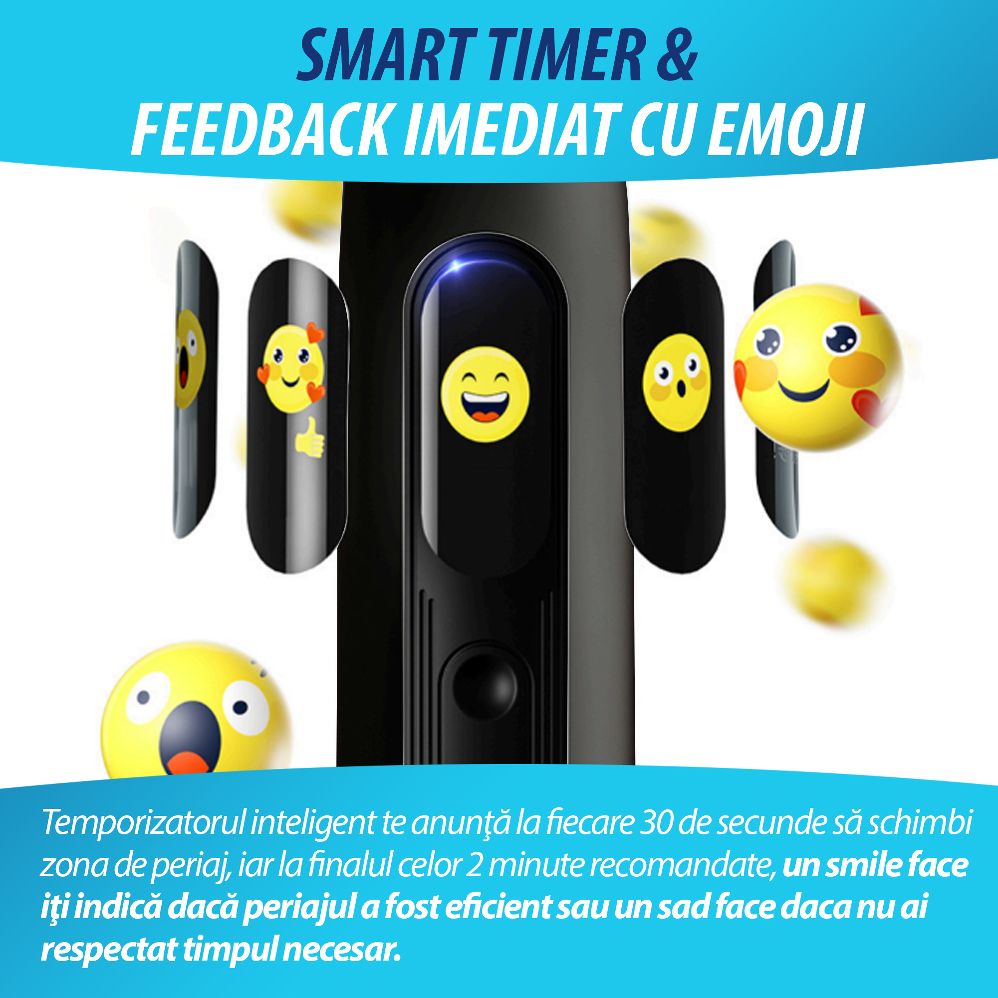 - Smart Timer si Feedback Imediat: Temporizatorul inteligent te anunta la fiecare 30 de secunde sa schimbi zona de periaj, iar la finalul celor 2 minute recomandate, un smile face iti indica daca periajul a fost eficient, sau un sad face daca nu ai respectat timpul necesar.