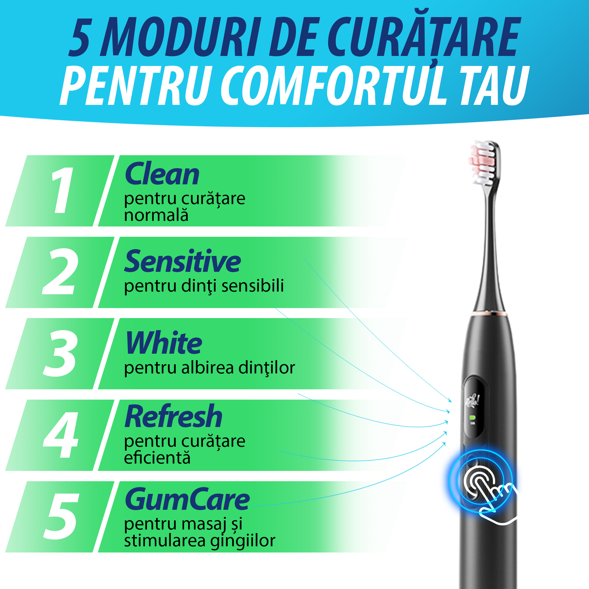 - 5 Moduri de Periaj Personalizate: Alege din 5 moduri diferite – Clean, Sensitive, White, Refresh, GumCare– fiecare cu intensitatea reglabila, astfel incat sa gasesti combinatia perfecta pentru nevoile tale dentare.